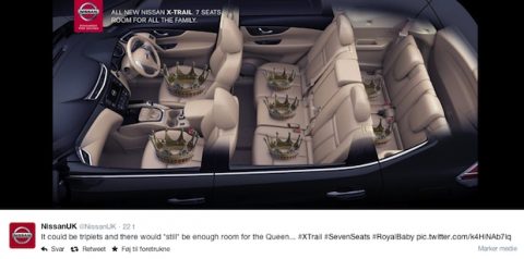 Helt præcist rykkede Nissan UK ud med taktisk annoncering bare syv minutter efter, at kongehuset havde offentliggjort nyheden om, at William og Kate ventede deres andet barn.