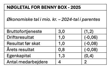 ”Benny Box har haft et økonomisk stærkt 2025 med et resultat på omkring en million kroner på bundlinjen. Projekter som otte animerede undervisningsfilm om EU for Folketinget og det prisvindende arbejde med Financial Times har skabt øget synlighed,” lyder det fra Lars Berntsen.