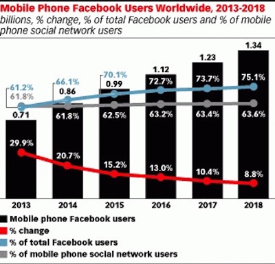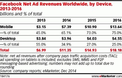 I 2013 kom 45 procent af Facebooks 6,99 mia. dollar i reklameindtægter fra mobile annoncer, i år ventes tallet at blive 73 procent og 10,9 mia. dollar – og til næste år tror eMarketer på, at Facebook henter hele 13,64 mia. dollar hjem i reklameindtægter via mobilen.