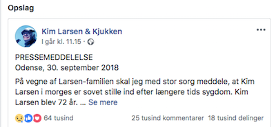 Kim Larsen var folkekær – det er sagt mange gange – og nyhedsmediernes adfærd i går og i dag afspejler det. Men også de sociale medier understreger, hvor stor rækkevidde han havde i forhold til danskerne.