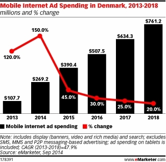 Væksten i den danske mobilannoncering beskrives således i en analyse foretaget af eMarketer som ”fænomenal”, og forventningen er, at danske annoncører vil investere over 1,6 milliarder annoncekroner på tværs af mobile enheder i år. Det er en fremgang på 150 procent i forhold til i 2013.