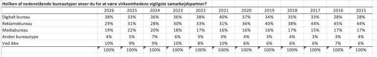 Til sammenligning peger 29 procent af respondenterne på reklamebureauerne som vigtigste partner – en lille tilbagegang på to procentpoint fra sidste år.