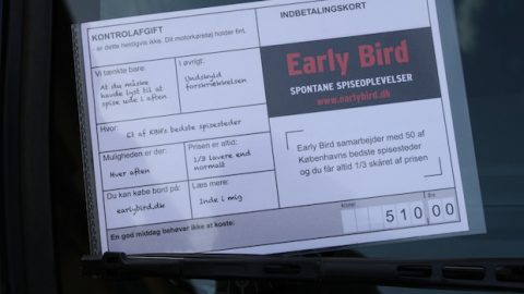 Fredag morgen var 40.000 biler i København udstyret med en lap papir, der til forveksling lignede en parkeringsbøde. Men det var et reklame-stunt. Fra deal-sitet earlybird.dk.