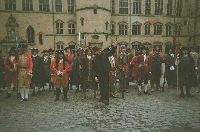 Skuespillere, hest, dressurrytter, statister, Ole Hoffmann, Kristoffer Winter, Karina Petersen, et filmcrew fra New Land, tre musket-ansvarlige fra Nationalmuseet, runners, lydfolk, kostumeeksperter – og ikke mindst instruktør Tore Frandsen – står klar til optagelserne.