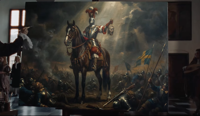 ”I dag … drager vi mod Sverige,” siger kongen, og vifter henkastet med sin højre hånd, mens flokken af soldater bryder ud i jubel – lige indtil en af dem, der står forrest, vover sig frem.