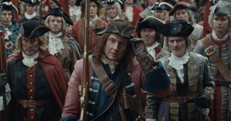 ”På den baggrund bliver det jo nærmest endnu mere grotesk, at den danske stat beordrede soldaterne iført kjoler og filthatte, men svenskerne af deres konge var beordret til at benytte de der krebsehalehjelme, de har på i filmen.”