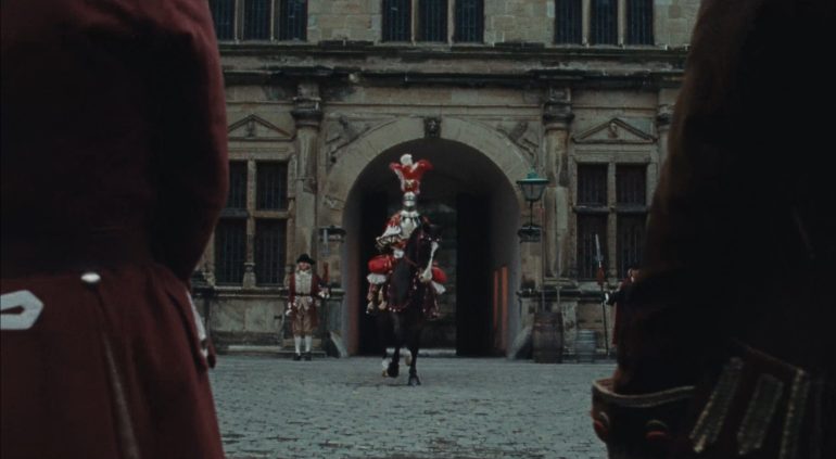 Vi befinder os på Kronborg – hvor en sejrssikker kong Christian V i slottets balsal lader sig iføre brynje og metalhjelm med store røde og hvide fjer, mens tjenestefolkets børn nysgerrigt kigger ind gennem en dørsprække.